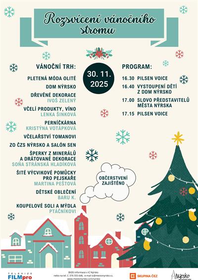 1. adventní neděli rozsvítíme v Nýrsku strom na náměstí. Těšit se můžete na vánoční trh, svým vystoupením vás potěší PILSEN VOICE a děti z DDM Nýrsko. Přijďte načerpat tu pravou atmosféru předvánočního času. Občerstvení zajištěno.