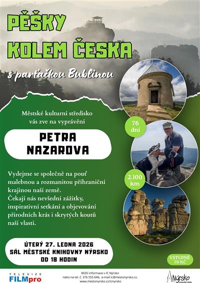Vyprávění Petra Nazarova o malebné a rozmanité příhraniční krajině naší země. Vstupné je 70 Kč. Bublina parťákem na cestě kolem Česka Po celé řadě cest do zahraničí a několika letech strávených v cizích zemích se vydal cestovatel a fotograf Petr Nazarov poznávat také naši zemi. Na jeho pěší túře, která vedla malebnou a rozmanitou příhraniční krajinou, jej doprovázela border kolie Bublina. Jaká byla 76 dní trvající a 2100 km dlouhá pouť uvidíte a uslyšíte jen když mezi nás zavítáte. Besedu pro vás chystáme v úterý 27. ledna 2026 od 18.00 ve společenském sále Městské knihovny v Nýrsku, vstupné je 70 Kč. | ||