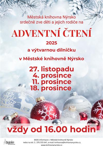 Městská knihovna Nýrsko srdečně zve všechny děti a jejich rodiče na 2. Adventní čtení s výtvarnou dílničkou.