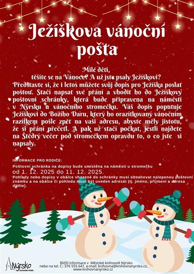 Těšíte se na Vánoce? A už jste psaly Ježíškovi? Představte si, že i letos můžete svůj dopis pro Ježíška poslat poštou. Stačí napsat své přání a vhodit ho do Ježíškovy poštovní schránky, která bude připravena na náměstí v Nýrsku u vánočního stromečku.