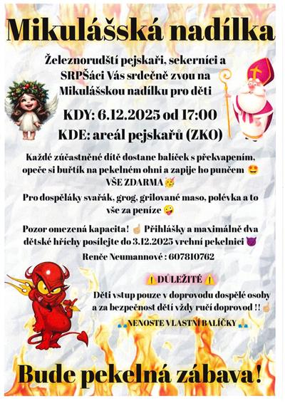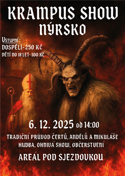 Tradiční průvod čertů, andělů a Mikuláše. V areálu na vás čeká Peklo a nebe pro děti a rukodělné stánky. Z účinkujících se vám představí Diamond Dance, bubenická show ŠamanaMaya, Fireshow a tradiční Krampus lauf (exhibice masek Teufel der Šumava). Vstupné děti 100 Kč, dospělí 250 Kč.