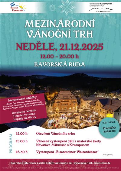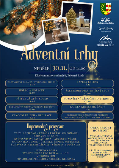 Historicky první adventní trhy v Železné Rudě, které vznikly ve spolupráci Města Železná Ruda s Destinací Šumava žije. Letos poprvé přinesou do města nejen sváteční atmosféru a lokální výrobky, ale také živý betlém se skutečnými ovečkami-novinku, která vytvoří jedinečný zážitek pro malé i velké.