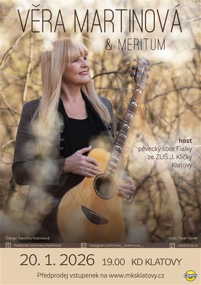 Věra v příštím roce oslaví 40 let na sólové dráze! Přijďte si vychutnat večer plný hudby ve společnosti skvělých muzikantů. Věra Martinová je výraznou osobností naší hudební scény s nezaměnitelným stylem, kterou jistě není třeba dlouze představovat. Byť je Věra Martinová často nazývána „první dámou české country“ či „stálicí domácí populární hudby“, sama se cítí být především muzikantkou tělem a duší, která je otevřena všem hudebním inspiracím a vlivům. Chce své posluchače i nadále příjemně překvapovat pěknými písničkami s kvalitními texty. Věru Martinovou doprovodí skupina Meritum : Bára Juránková – housle, vokály, Jakub Juránek – kytary, vokály, Jan Neruda – basová kytara, vokály, Adrian Ševeček – bicí. Host: pěvecký sbor Fialky ( ZUŠ J. Kličky Klatovy) | ||