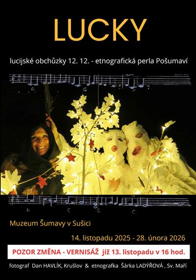 Po několik staletí obcházely 12. prosince v předvečer svátku sv. Lucie domácnosti v podhůří Šumavy LUCKY. Lucky, lucije, lůcy či Perchty a Brůhy chodívaly i jinde. Ovšem pošumavské LUCKY mají svoji specifickou, unikátní podobu, která se jinde nevyskytuje. Obchůzka lucek, dříve běžně rozšířená v celém historickém Prácheňském kraji, se do dnešních dnů udržuje v posledních dvou obcích na Vimpersku. Fotograf Dan Havlík z Krušlova a etnografka a výtvarnice Šárka Ladýřová ze Svaté Maří se dokumentaci a výzkumu pošumavských lucek věnují již 20 let. Přijďte se podívat, jak dnes obchůzka tajemných, rozdováděných lucek vypadá, poslechnout si jejich unikátní písničku a dozvědět se, jak souvisí postava rodáka ze Svéradic, neobyčejného jezuitského misionáře a zakladatele Klatovské koleje Albrechta Chanovského s touto etnografickou perlou Pošumaví.