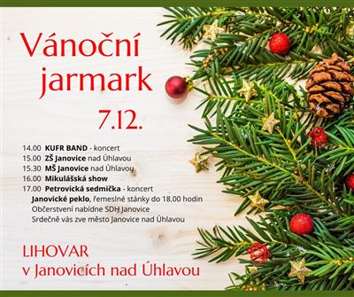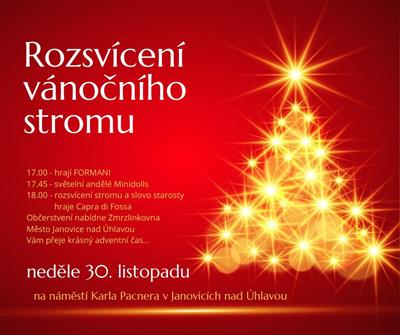 Při slavnostním rozsvícení vánočního stromu zahraje: 17.00 - hudební skupina FORMANI, 17.45 - zatančí světelní andělé MIIDOLLS, 18.00 - rozsvícení stromu, 18.05 - zahraje hudební skupina CAPRA DI FOSSA. Výtečné občerstvení zajistí Zmrzlinkovna. Srdečně vás zve město Janovice nad Úhlavou.