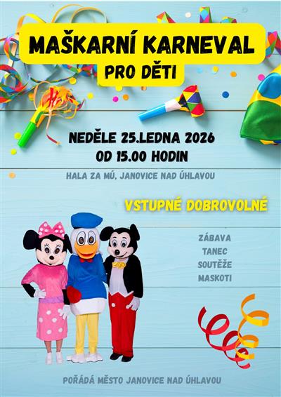 Tradiční maškarní karneval pro děti v hale za MÚ Janovice. Vstupné je dobrovolné.