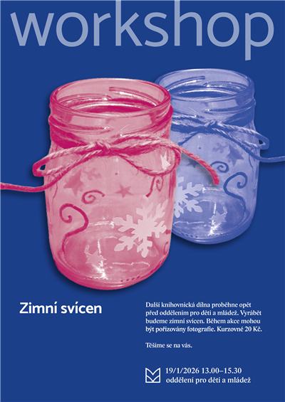 Přijďte si s námi vyrobit zimní svícen. Knihovnická dílna proběhne jako obvykle před oddělením pro děti a mládež. Kurzovné 20 Kč. Těšíme se na vás!