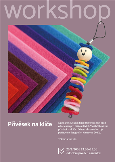 Přijďte si s námi vyrobit přívěsek na klíče. Knihovnická dílna proběhne jako obvykle před oddělením pro děti a mládež. Kurzovné 20 Kč. Těšíme se na vás!