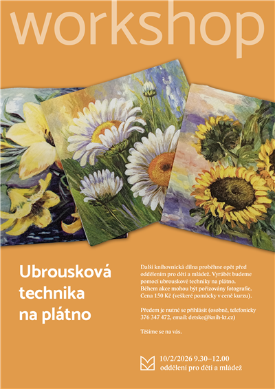 Zveme vás na knihovnickou dílnu, při které budeme ubrouskovou technikou zdobit plátno. Cena 150 Kč (veškeré pomůcky v ceně kurzu). Je nutné se přihlásit předem (osobně, telefonicky 376 347 472, email: detske@knih-kt.cz). Těšíme se na vás.