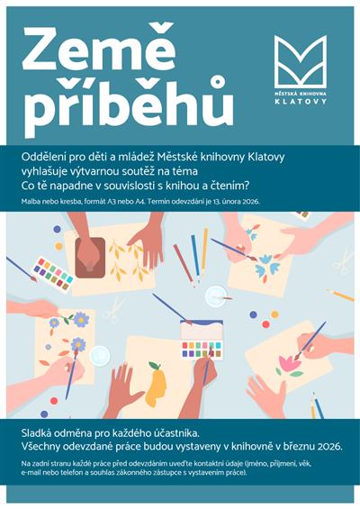 Dětské oddělení Městské knihovny Klatovy vyhlašuje výtvarnou soutěž na téma ZEMĚ PŘÍBĚHŮ. Nakreslit můžete vše, co jen souvisí s knížkou a čtením (oblíbená postava, svět, bájné zvíře...). Obrázky (A4 nebo A3) odevzdávejte do 13. února v dětském oddělení. Zúčastnit se mohou všichni, kdo rádi malují bez rozdílu věku. Na zadní stranu obrázku napište jméno autora, věk, kontakt a souhlas zákonného zástupce s vystavením práce (v případě, že je účastník mladší 18 let). Na všechny výtvarníky čeká sladká odměna. | ||