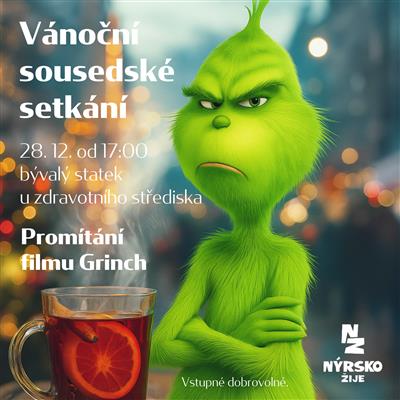 Tradiční vánoční sousedské setkání přinese 28. 12. od 17:00 na bývalý statek u zdravotního střediska příjemnou atmosféru, svařák a hlavně promítání klasického hraného filmu Grinch. Přijďte si odpočinout mezi svátky, potkat sousedy a užít si společný večer plný pohody. Vstupné je dobrovolné.