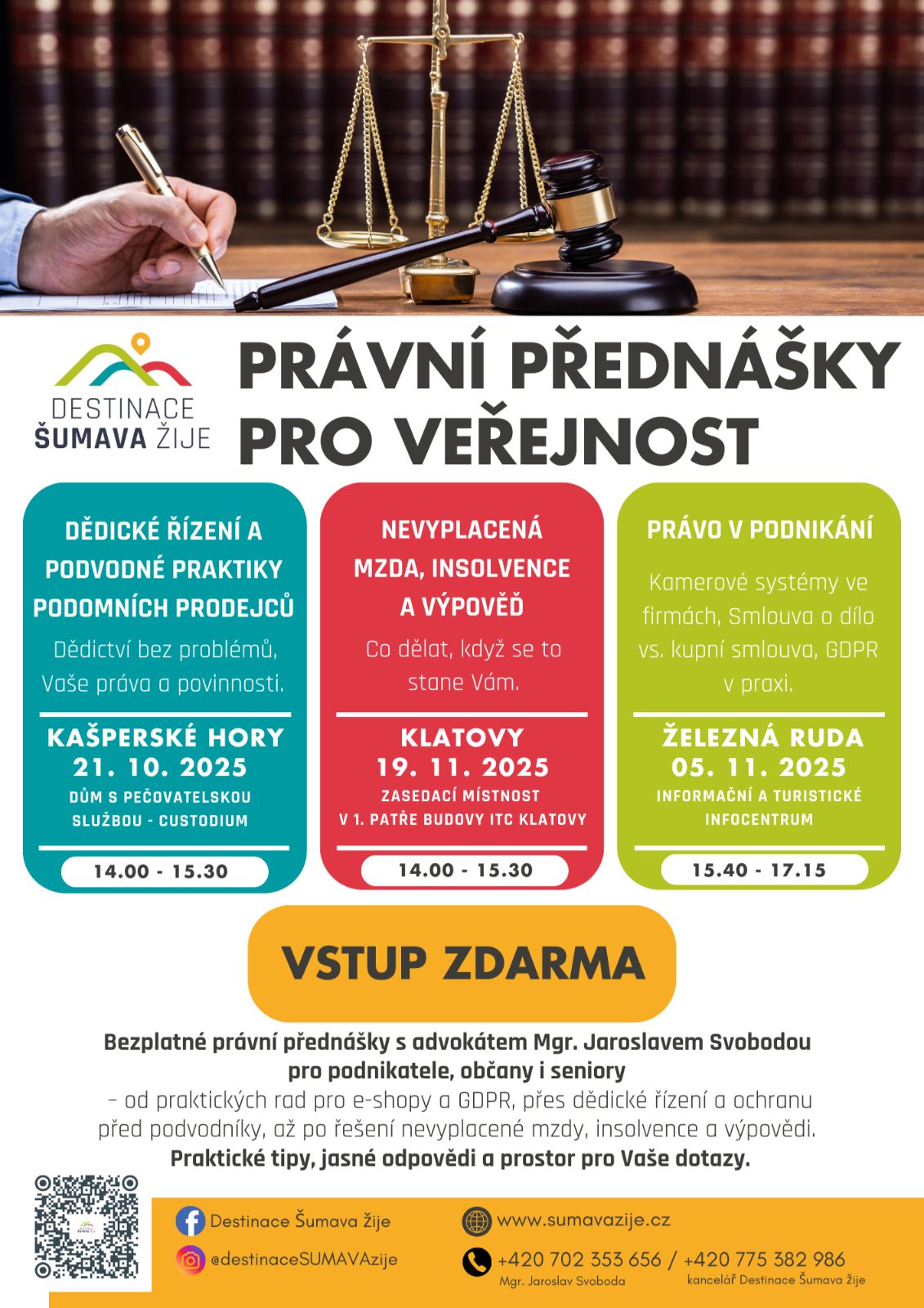 Chcete se vyznat v zákonech, chránit své podnikání, majetek i sebe? Přijďte na sérii bezplatných právních přednášek vedených zkušeným advokátem Mgr. Jaroslavem Svobodou. Čekají vás praktické rady, jasná vysvětlení a prostor pro vaše dotazy – bez složité právnické hantýrky, zato s konkrétními příklady z praxe.