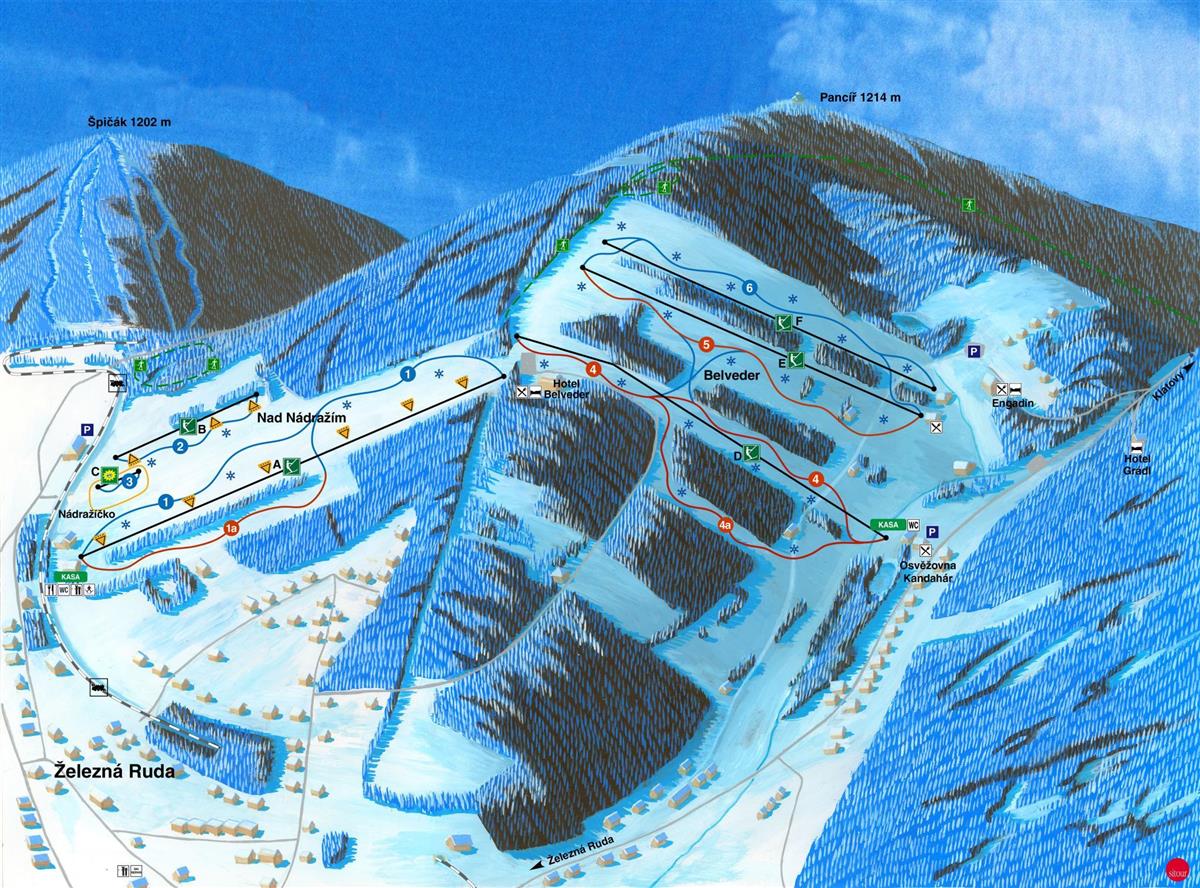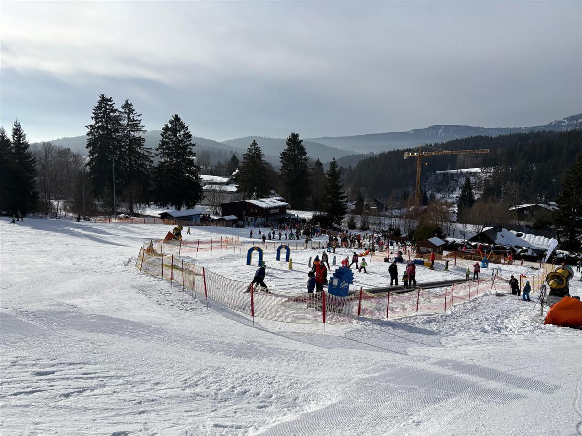Rodinně laděný areál v srdci Železné Rudy nabízí skvělé podmínky pro lyžování začátečníků, rodin s dětmi i rekreačních lyžařů. Díky výborné dostupnosti vlakem (300 m od nádraží) a propojení dvou areálů – Nad nádražím a Belveder – je to ideální volba pro pohodový den na sněhu. K dispozici je 7 upravovaných sjezdovek (červené a modré), večerní lyžování i dětský park s pohyblivým pásem a kolotočem. Vleky mají celkovou kapacitu přes 4 000 osob za hodinu, svahy jsou zasněžované a dvakrát denně upravované. Areál disponuje i lyžařskou školou a bufetem s terasou a výhledem na Velký Javor. Parkování je možné zdarma v blízkosti. V létě je areál atraktivní díky slalomovým kárám, trampolínám a lanovému parku.