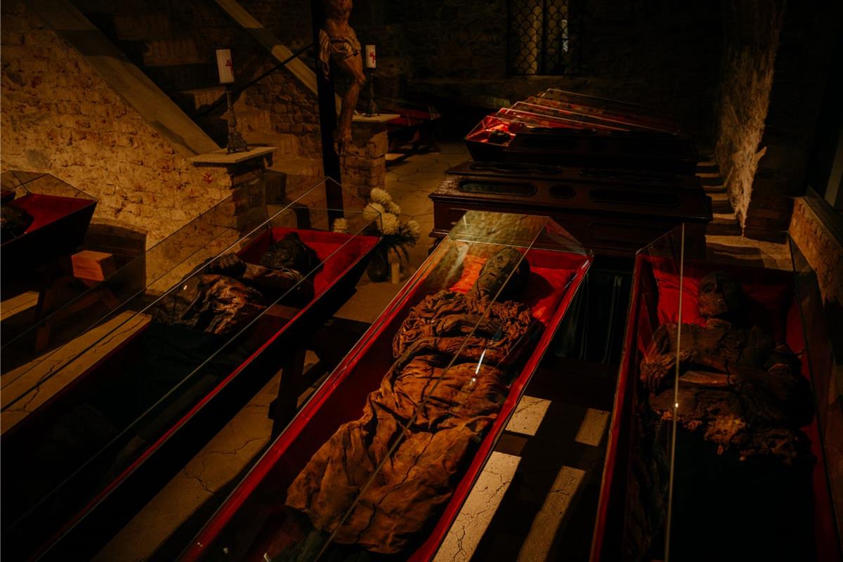 A proč těla zůstala zachována tak dlouho? Krypty měly jedinečný větrací systém. Studený vzduch proudil speciálními otvory, horký zase stoupal komíny až ke střeše. Těla byla uložena do dubových rakví vystlaných hoblinami a chmelem. Příroda a chytře vymyšlená technika tu sehrály roli dokonalých konzervátorů.