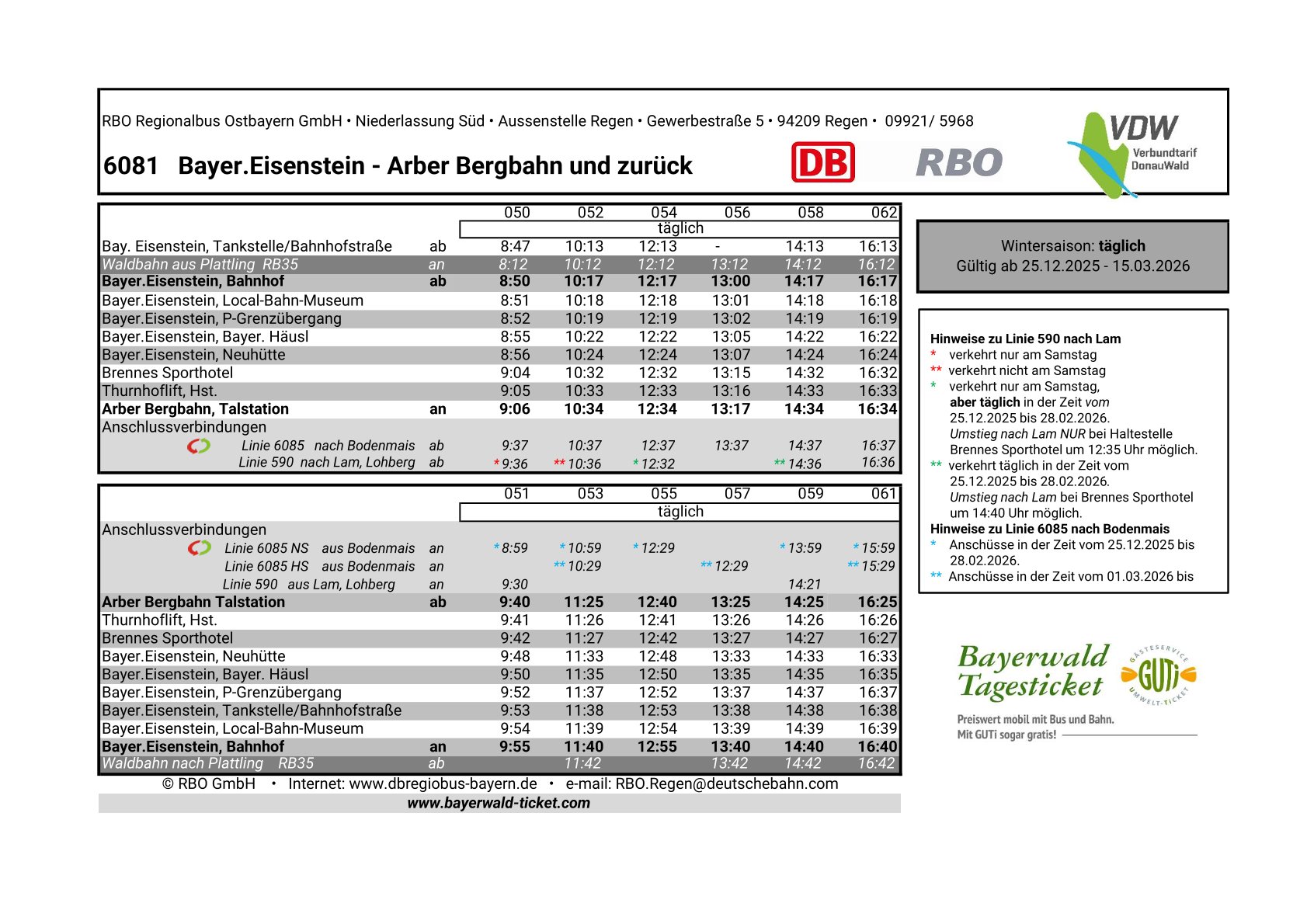 Z Bavorské Rudy na běžkařskou dráhu Bretterschachten Varianta 1:Bus 6081 zum Großen ArberLinie 6085 Richtung Bodenmais Varianta 2:Zug nach Ludwigsthal/ ZwieselLinie 6191 Richtung Arber Bergbahn