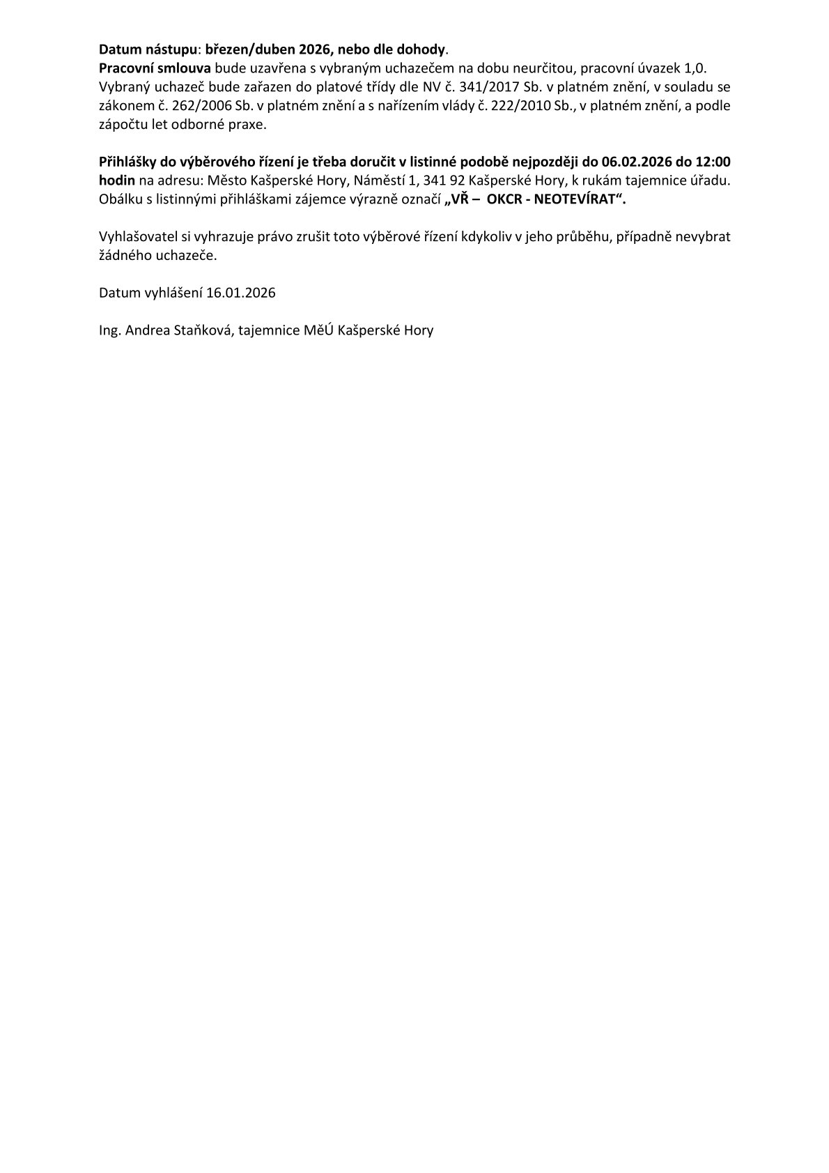 Město Kašperské Hory hledá vedoucího Odboru kultury a cestovního ruchu