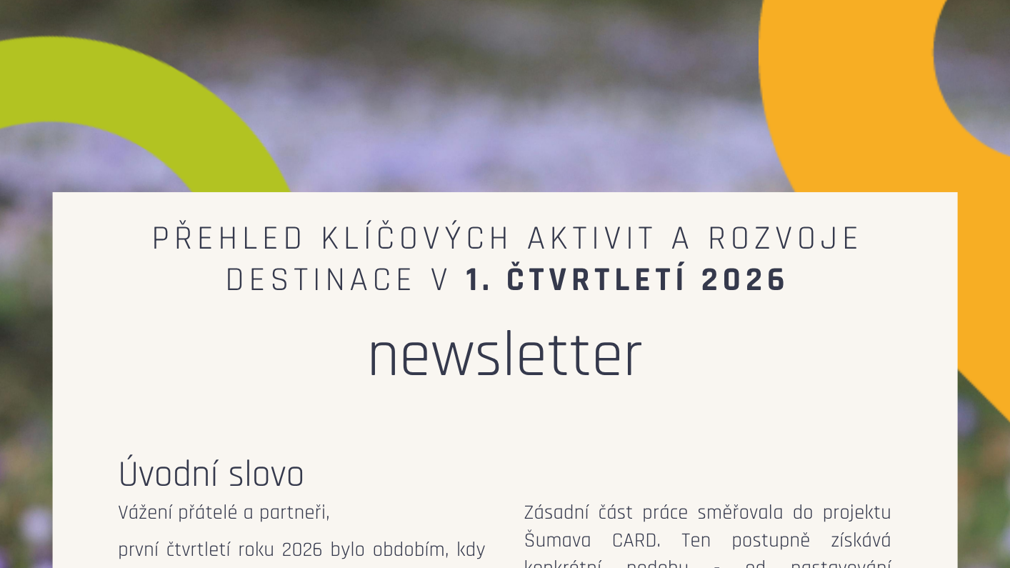 Newsletter Newsletter leden - březen 2026Aktuální projekty, workshopy, akce a pozvánky a mnoho dalšího!Velikonoční kompas 01. 04. - 06. 04. 2026aneb všechno, co potřebujete tento týden vědět o destinaciŠumavský kompas 13. 03. - 19. 03. 2026aneb všechno, co potřebujete tento týden vědět o destinaciŠumavský kompas 06. 03. - 12. 03. 2026aneb všechno, co potřebujete tento týden vědět o destinaciŠumavský kompas 27. 02. - 05. 03. 2026aneb všechno, co potřebujete tento týden vědět o destinaciŠumavský kompas 20. 02. - 26. 02. 2026aneb všechno, co potřebujete tento týden vědět o destinaciŠumavský kompas 13. 02. - 19. 02. 2026aneb všechno, co potřebujete tento týden vědět o destinaciŠumavský kompas 06. 02. - 12. 02. 2026aneb všechno, co potřebujete tento týden vědět o destinaciŠumavský kompas 30. 01. - 05. 02. 2026aneb všechno, co potřebujete tento týden vědět o destinaciŠumavský kompas 23. 01. - 29. 01. 2026aneb všechno, co potřebujete tento týden vědět o destinaciŠumavský kompas 16. 01. - 22. 01. 2026aneb všechno, co potřebujete tento týden vědět o destinaciŠumavský kompas 09. 01. - 15. 01. 2026aneb všechno, co potřebujete tento týden vědět o destinaciŠumavský kompas 01. 01. - 08. 01. 2026aneb všechno, co potřebujete tento týden vědět o destinaciŠumavský kompas 26. 12. - 01. 01. 2026aneb všechno, co potřebujete tento týden vědět o destinaciŠumavský kompas 19. 12. - 26. 12. 2025aneb všechno, co potřebujete tento týden vědět o destinaciNewsletter prosinec 2025Aktuální projekty, workshopy, akce a pozvánky a mnoho dalšího!Newsletter listopad 2025Aktuální projekty, workshopy, akce a pozvánky a mnoho dalšího!Newsletter říjen 2025Aktuální projekty, workshopy, akce a pozvánky a mnoho dalšího!Newsletter září 2025Aktuální projekty, workshopy, akce a pozvánky a mnoho dalšího!Newsletter srpen 2025Aktuální projekty, workshopy, akce a pozvánky a mnoho dalšího!Newsletter červenec 2025Aktuální projekty, workshopy, akce a pozvánky a mnoho dalšího!Newsletter červen 2025Aktuální projekty, workshopy, akce a pozvánky a mnoho dalšího!