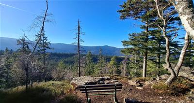 Na Horské Kvildě najdete Klostermannovu lavičku – dřevěné posezení s výhledem na šumavské hřebeny, kde se ticho lesa mění v poctu spisovateli a výzvu ke zpomalení.